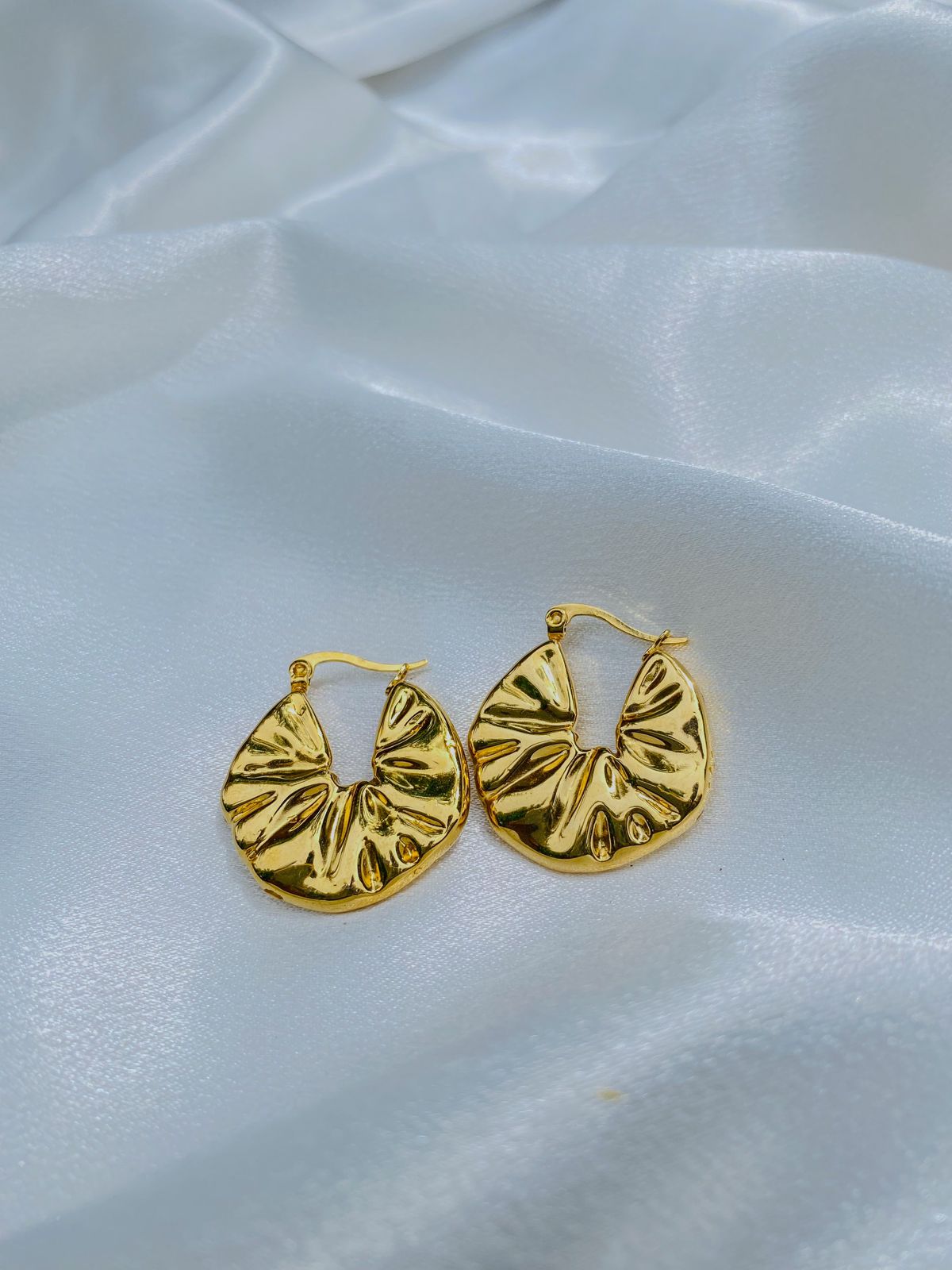 The textured molten folds catch the light from every angle, creating a dramatic yet refined look. Their crescent silhouette adds a unique twist to the classic hoop, making them perfect for young women who love luxury with a modern edge.